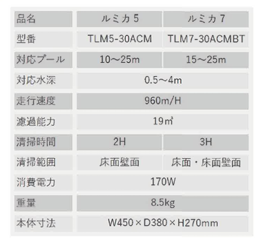 PRODUCTS ホーム製品紹介プールクリーナー・清掃用品全自動プールクリーナー <coming soon>ルミカ7(キャディカート付き) TLM7-30ACMBT 電気用品安全法技術基準適合 お問い合わせ 製品仕様 対応プール15~25m 対応水深0.5~4m 消費電力170W サイズW:450×D:380×H:270㎜ 重量8.5㎏ 価格 950,000(税込1,045,000)